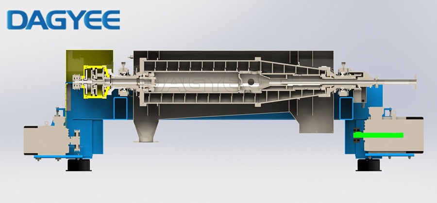 Centrifugal forces within DAGYEE decanters compact the solid phase and expel surplus liquid, resulting in a dewatered "cake" that is subsequently conveyed and discharge from the bowl. The clarified liquid phase—or multiple phases in the case of three-phase separation—overflows the dam plates or PowerTubes situated at the opposite end of the bowl. Internal baffles within the decanter casing direct each phase into its designated flow path, ensuring proper collection and eliminating cross-contamination risk. To accommodate fluctuations in the incoming solids loading, the speed of the screw conveyor may be automatically adjusted via a variable frequency drive (VFD) in combination with a torque control system, which continuously monitors the torque load on the conveyor. When solids loading increases, the system automatically adjusts the differential speed to prevent torque overload, ensuring stable operation and consistent dryness of the discharged solids. Conversely, under lighter loads, this speed is reduced to minimize wear and energy consumption.