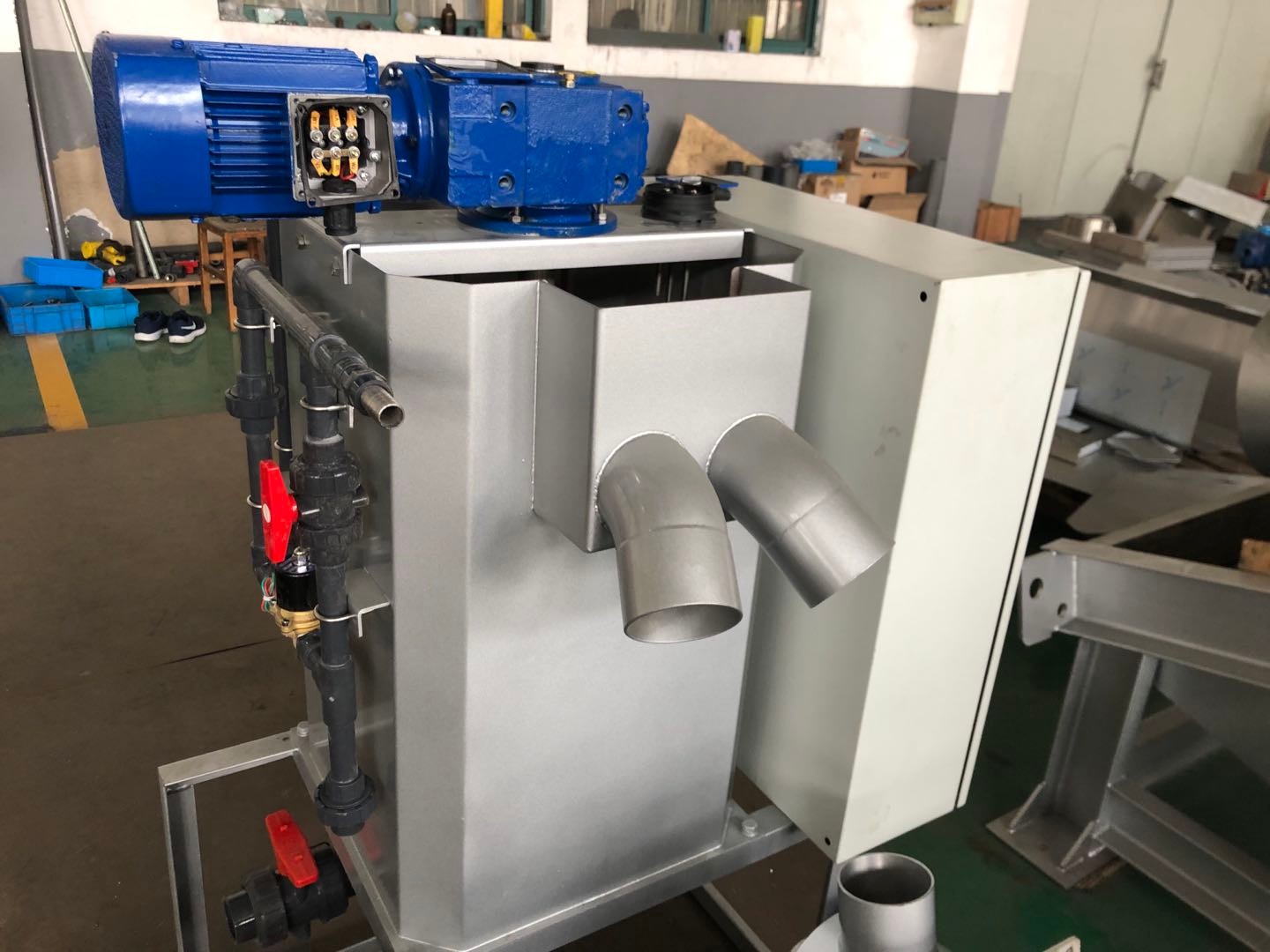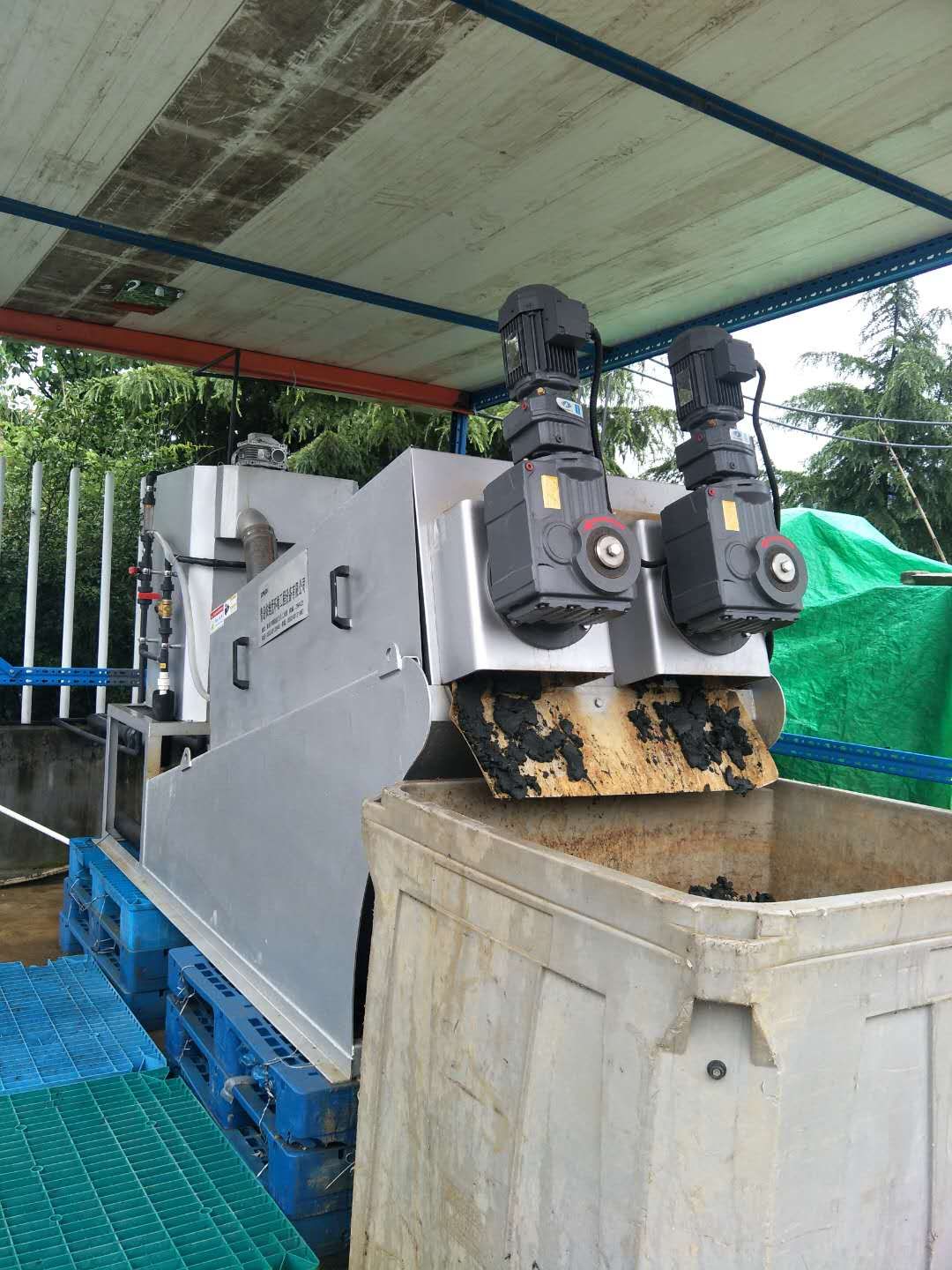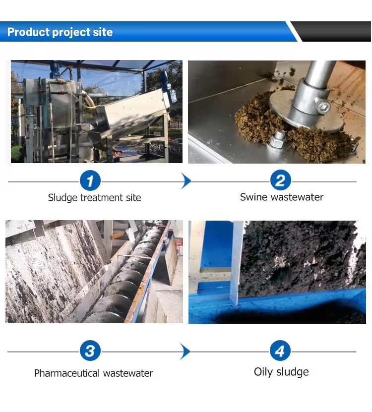 The main body of the sludge dewatering machine can be divided into two parts: in the first part where gravity concentration occurs, the screw will rotate downward and push out a mixture of water and solid materials that are below it.
