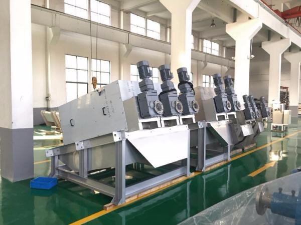 The rotation of the screw shaft produces a great internal pressure under the blocking action of the backpressure plate while pushing the sludge transportation so that the volume is continuously reduced, and the purpose of dewatering is finally achieved.