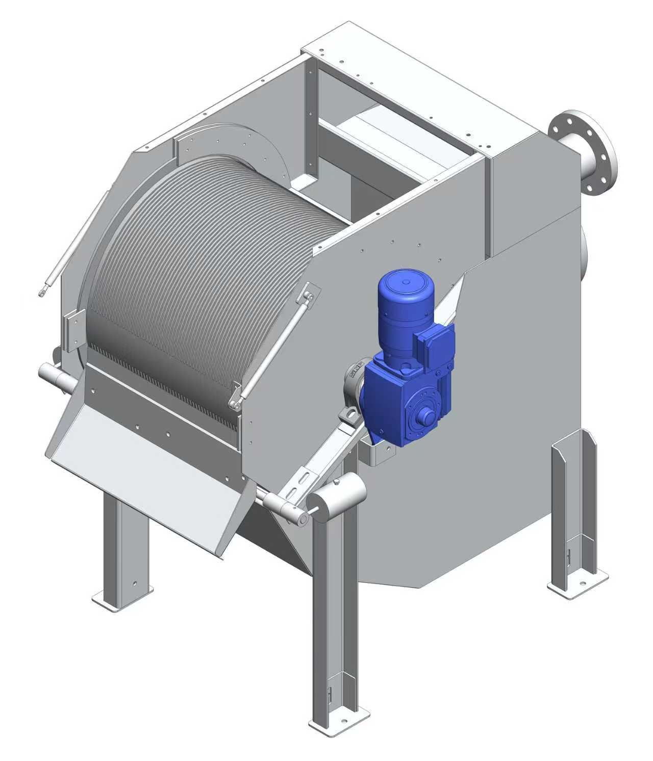 The design also solves the clogging problems that plague other fine screens. The rotating drum constantly brings fresh screen surface into contact with the incoming flow. The doctor blade physically scrapes off anything that sticks. And internal spray bars rinse the screen with every revolution. It's a system that's meant to stay clean without someone having to mess with it.