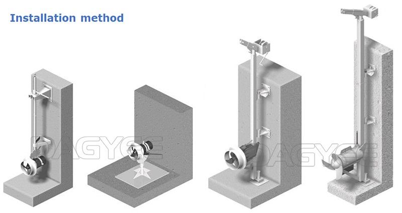 El mezclador sumergible deberá poder elevarse y bajarse, y deberá ser fácil de extraer para inspección o mantenimiento sin necesidad de que el personal entre en el tanque o pozo. El agitador tendrá un soporte de guía deslizante como parte integral del mismo; todo el peso del agitador deberá cargarse sobre un soporte que debe ser capaz de resistir todo el empuje causado por el agitador. El agitador, sus accesorios y cables, deberán ser capaces de permanecer sumergidos continuamente en agua hasta una profundidad máxima de 20 metros sin pérdida de estanqueidad.
