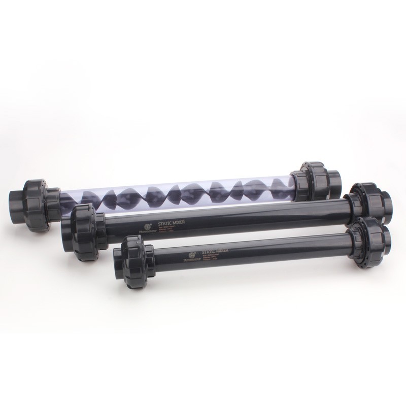 Los mezcladores estáticos UPVC tienen elementos de flujo que introducen dos corrientes de fluidos (o gases) en el mezclador estático. A medida que las corrientes se desplazan por el mezclador, los elementos inmóviles mezclan continuamente los materiales. La mezcla completa depende de muchas variables, como las propiedades de los fluidos, el diámetro interior del tubo, el número de elementos y su diseño. Los elementos fijos, normalmente helicoidales, del mezclador de elementos alojados pueden producir simultáneamente patrones de división del flujo y mezcla radial. También suministramos mezcladores estáticos transparentes que permiten supervisar el proceso y ayudan a optimizarlo, especialmente en sistemas de disolución en los que interviene una fase gaseosa.