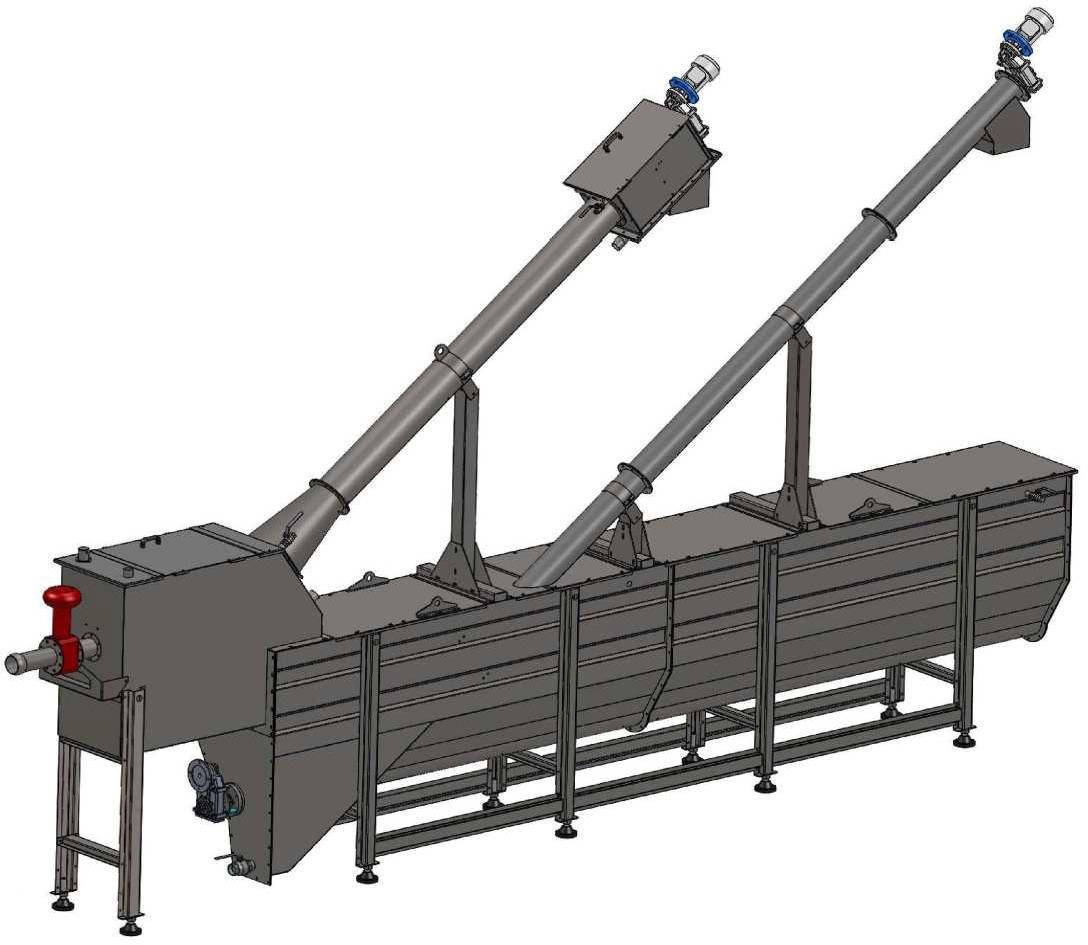 El agua que todavía tiene materiales sólidos en tamaños más pequeños fluye a través del tanque de sedimentación. Las partículas se sedimentan por tiempo y un tornillo sin fin horizontal las transporta a la tolva de recolección.