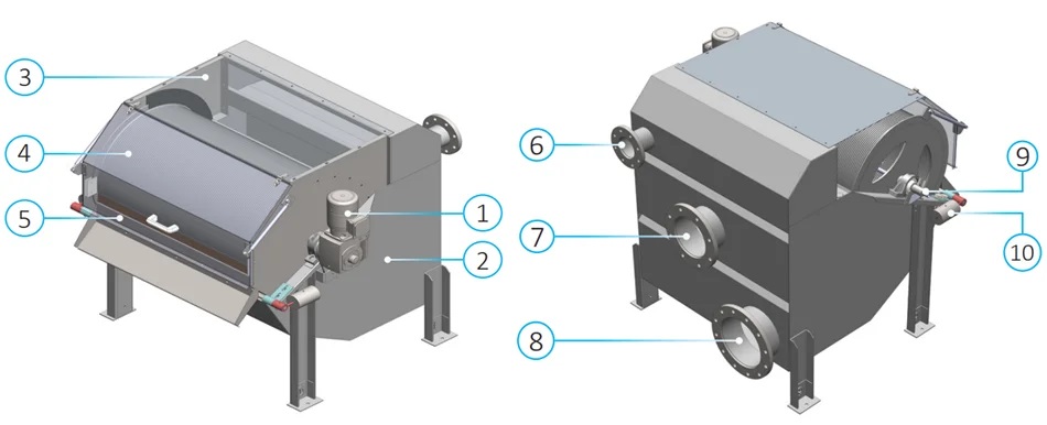 2. Tamiz de tambor rotativo con sentido de filtrado exterior/interior.