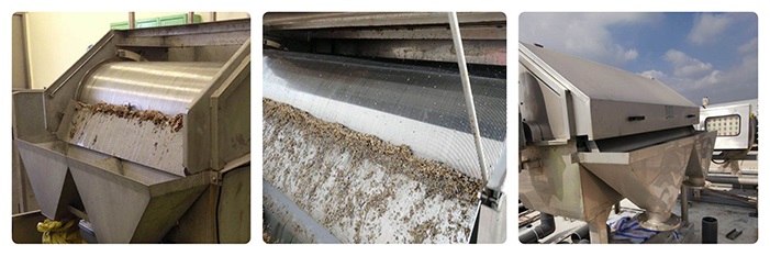 Las aguas residuales se transportan a la superficie exterior del tambor a través del distribuidor. Los sólidos se secuestran en la superficie de la criba a medida que el líquido filtrado pasa a través de los orificios de la criba y se drena hacia el tanque debajo del cilindro.