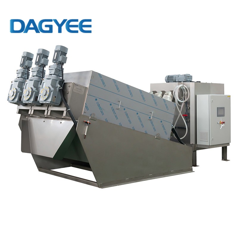 The rotation of the screw shaft produces a great internal pressure under the blocking action of the backpressure plate while pushing the sludge transportation so that the volume is continuously reduced, and the purpose of dewatering is finally achieved.