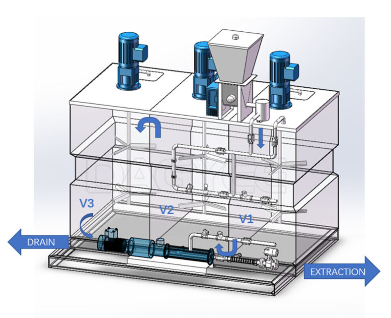 Старый раствор перетекает в резервуар. Оттуда дозирующие насосы подключают его к вашему осушительному оборудованию. Резервуар для хранения действует как буфер, так что ваш винтовой пресс или пресс ремня никогда не иссякнут.
