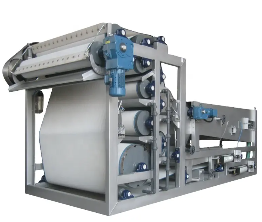 Пресс фильтра ремня использует два натянутых фильтра ремня для вытягивания воды из осадка, проходящего через серию роликов. Думай об этом, как о мокром полотенце.