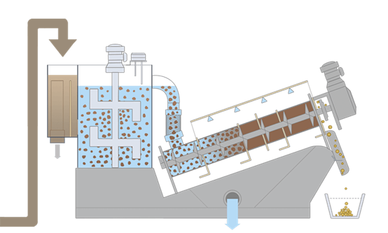 Винтовой пресс-новая технология. Он использует винтовой вал для проталкивания осадка через камеру, образуемую чередующимися фиксированными кольцами и движущимися кольцами. Объем уменьшается по мере продвижения шлама вперед, выдавливая воду. Движущиеся кольца вращаются винтом, создавая эффект самоочистки.