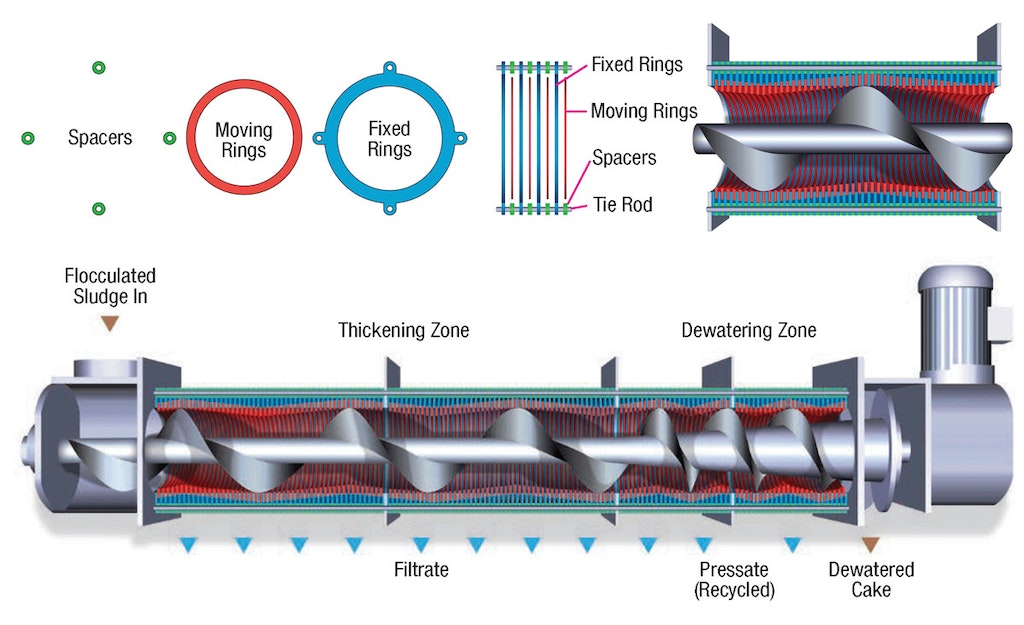 Dewatering Stage: The screw shaft rotates slowly, pushing sludge forward. As the chamber volume decreases, pressure builds, forcing water out through the gaps between moving and fixed rings while solids form a cake and discharge.