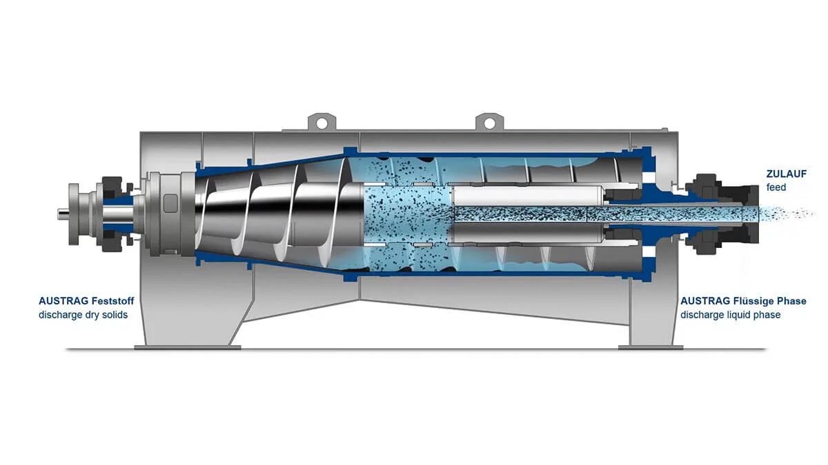 Feed goes into the rotating bowl. Centrifugal force throws solids against the bowl wall. A screw conveyor pushes the solids toward the discharge end. Liquid flows out the other end.